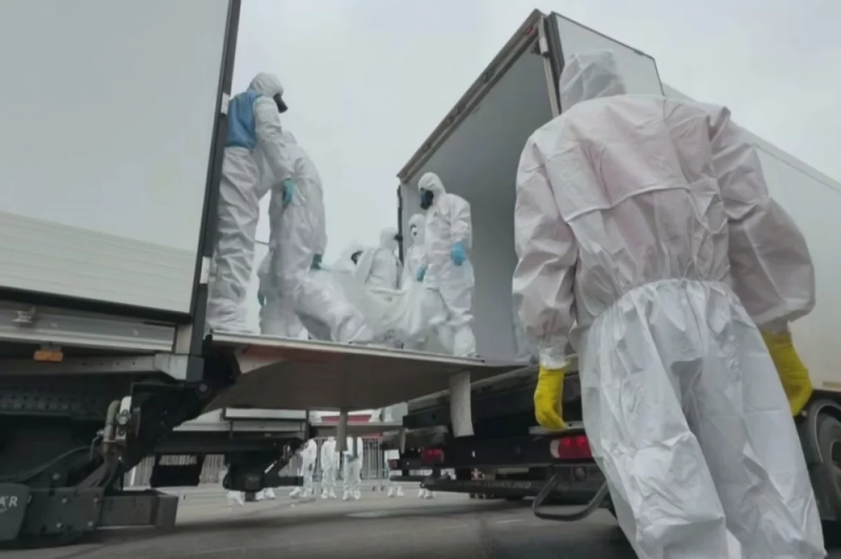 На обнародованной видеозаписи видно, как персонал в защитных костюмах перегружает останки из одного грузового автомобиля в другой.