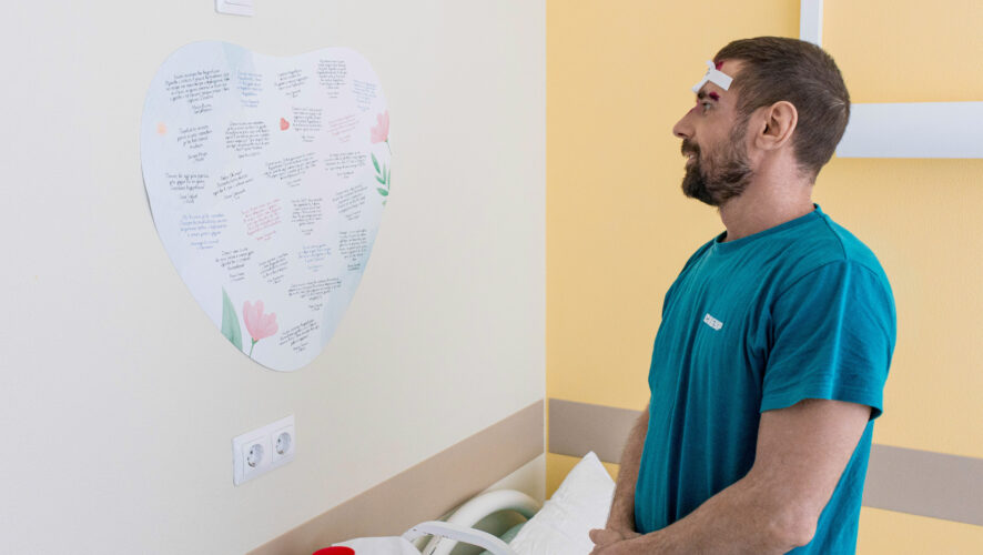 У его кровати коллеги оставили бумажное сердце с пожеланиями скорейшего выздоровления.
