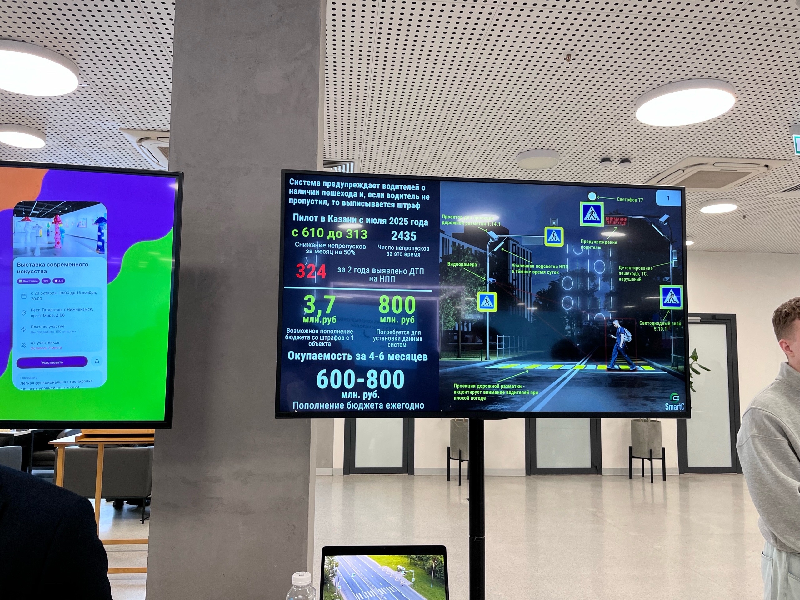Система считывает движение и предупреждает водителей о наличии пешехода. Если водитель его не пропустил — выписывается штраф. С начала реализации пилотного проекта на одном из объектов в Казани снизилось число непропусков с 610 до 313 случаев. На данный момент в Татарстане установлено два таких комплекса.